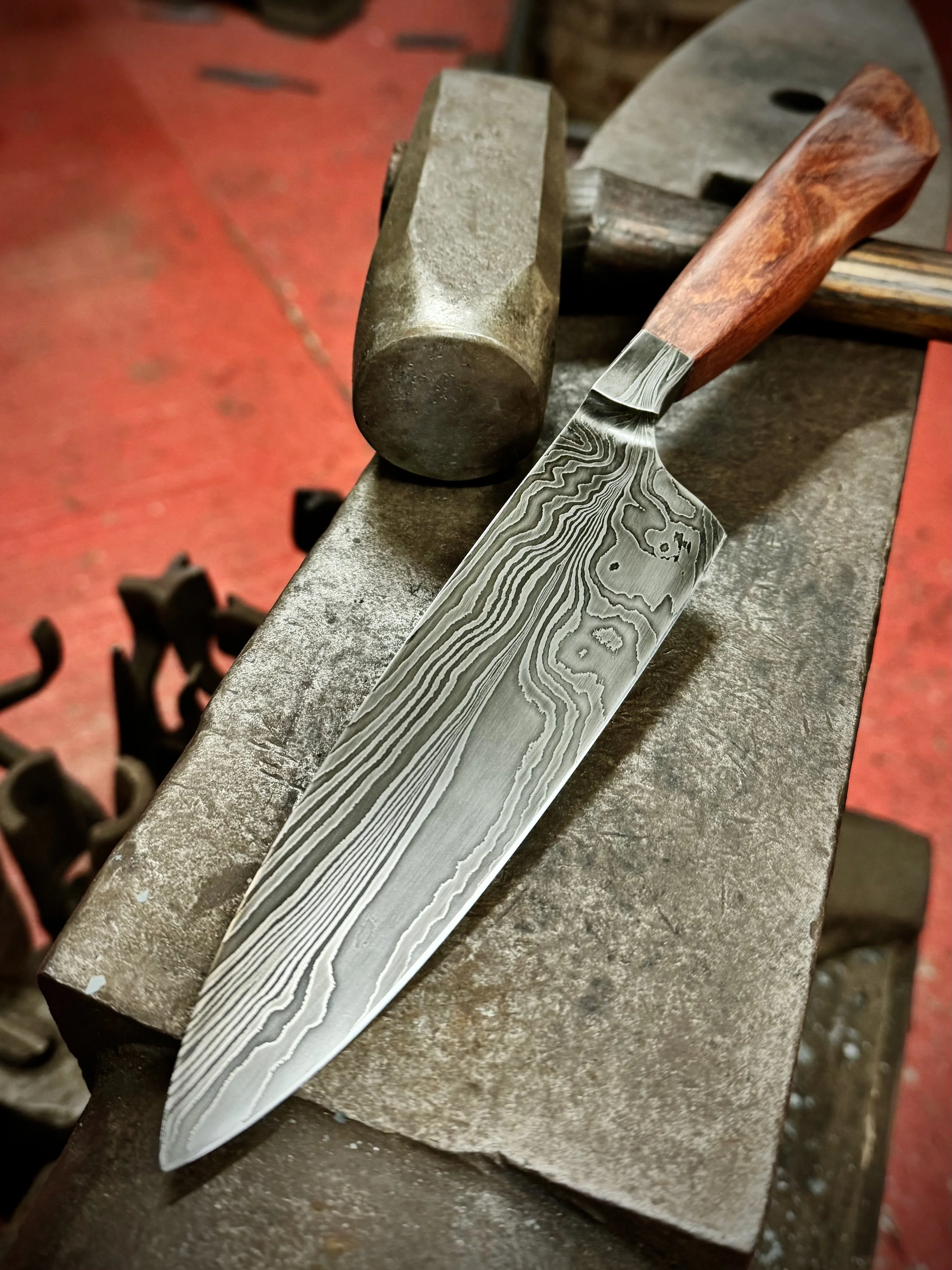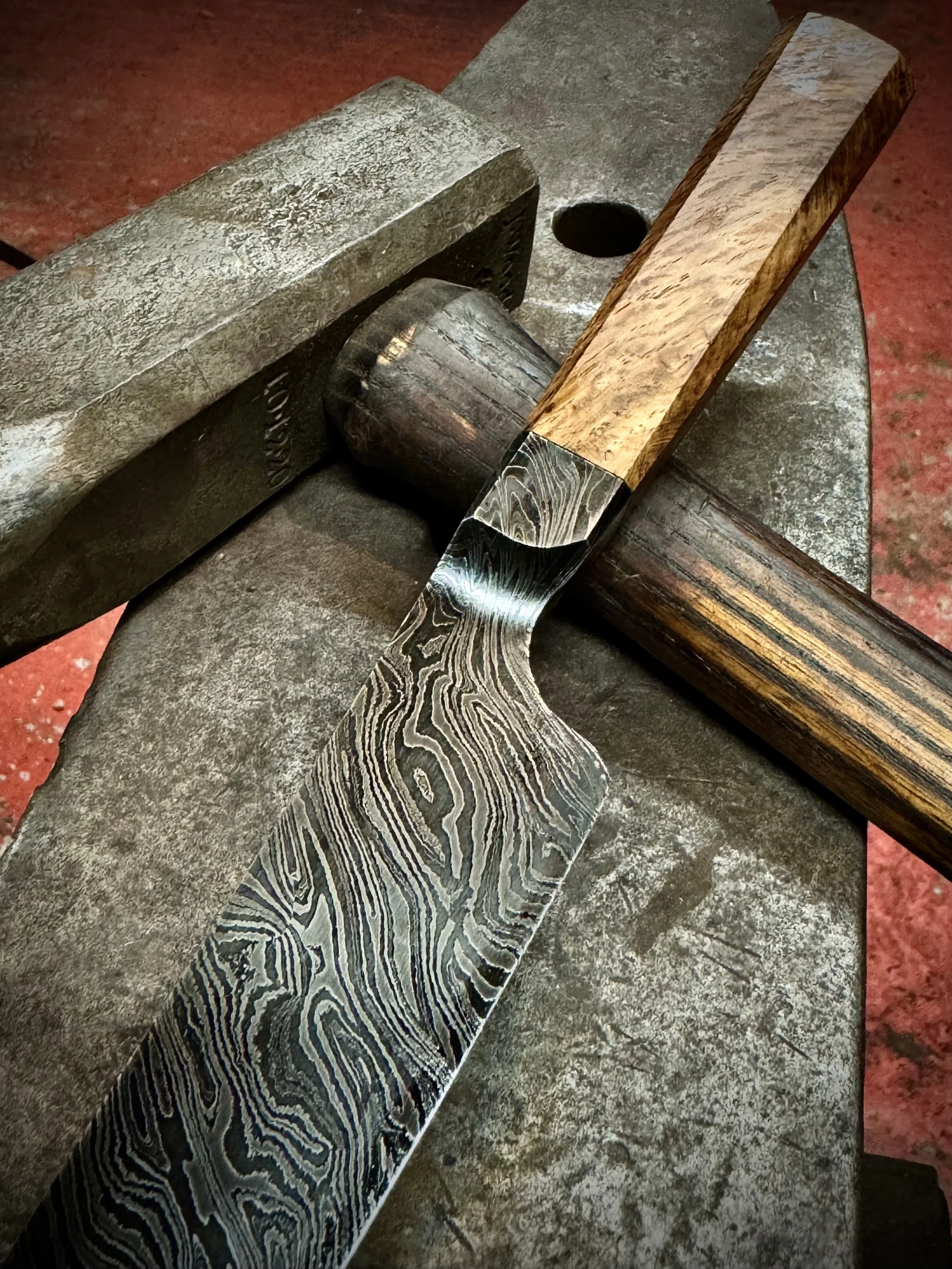 The Level-2 course is designed for students who have completed my Level-1 course and are ready to further explore the art of bladesmithing and pattern welding. Over three days, students will have the time they need to craft a medium-sized Damascus steel kitchen knife of their own design, complete with a forged integral bolster.